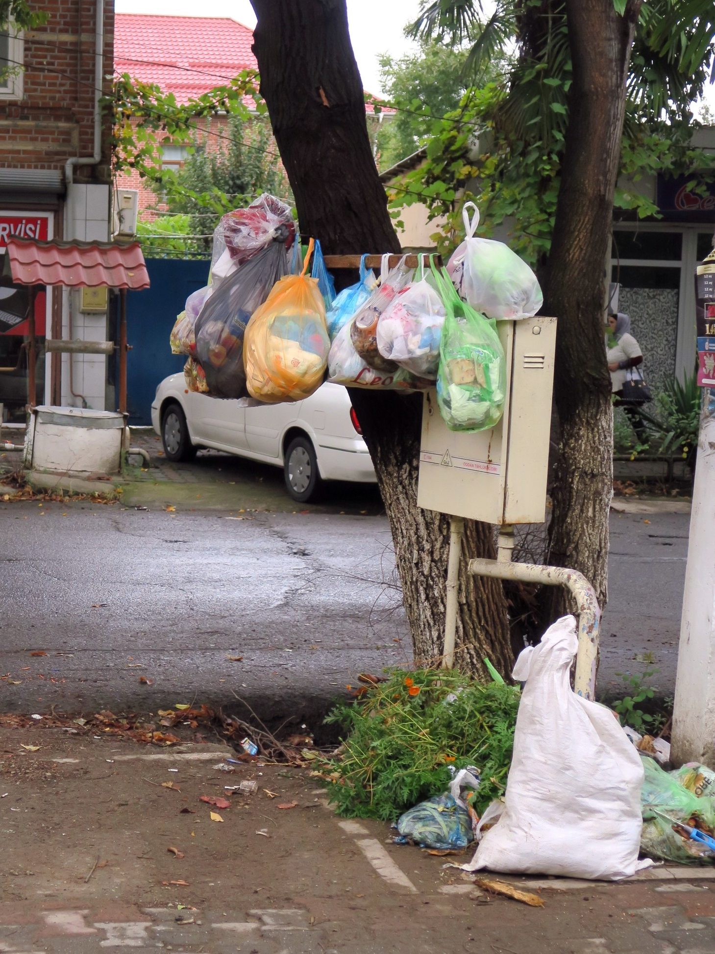 Auch Abfall entsorgen soll gelernt sein. Am Strassenrand befindet sich der ominöse Abfallbaum, an dem die gefüllten Abfallsäcke hängen, bis sie zweimal wöchentlich von der Müllabfuhr mitgenommen werden.